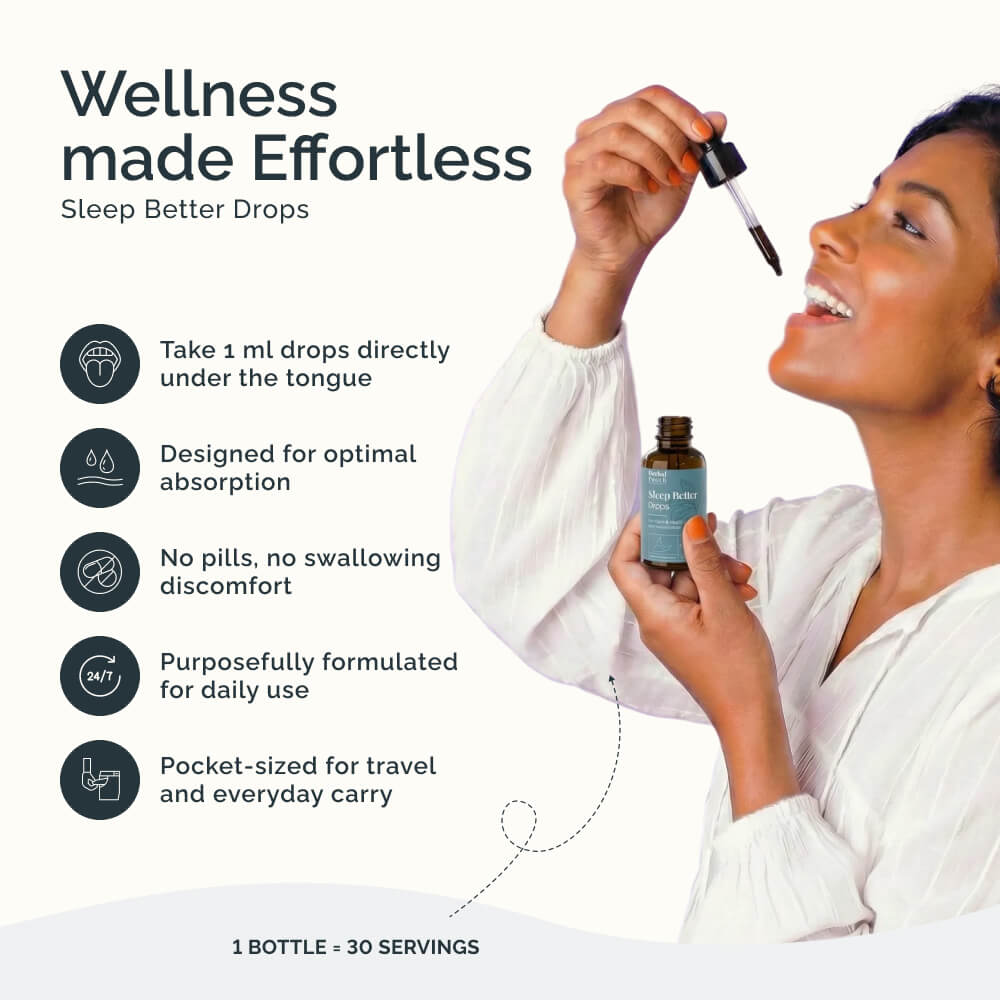 The liquid drop format allows the body to absorb ingredients more efficiently, supporting faster absorption and better bioavailability compared to many conventional formats. Easy to take and simple to adjust, it removes the friction of pills while encouraging consistent nightly use — an essential part of building a healthier sleep routine.